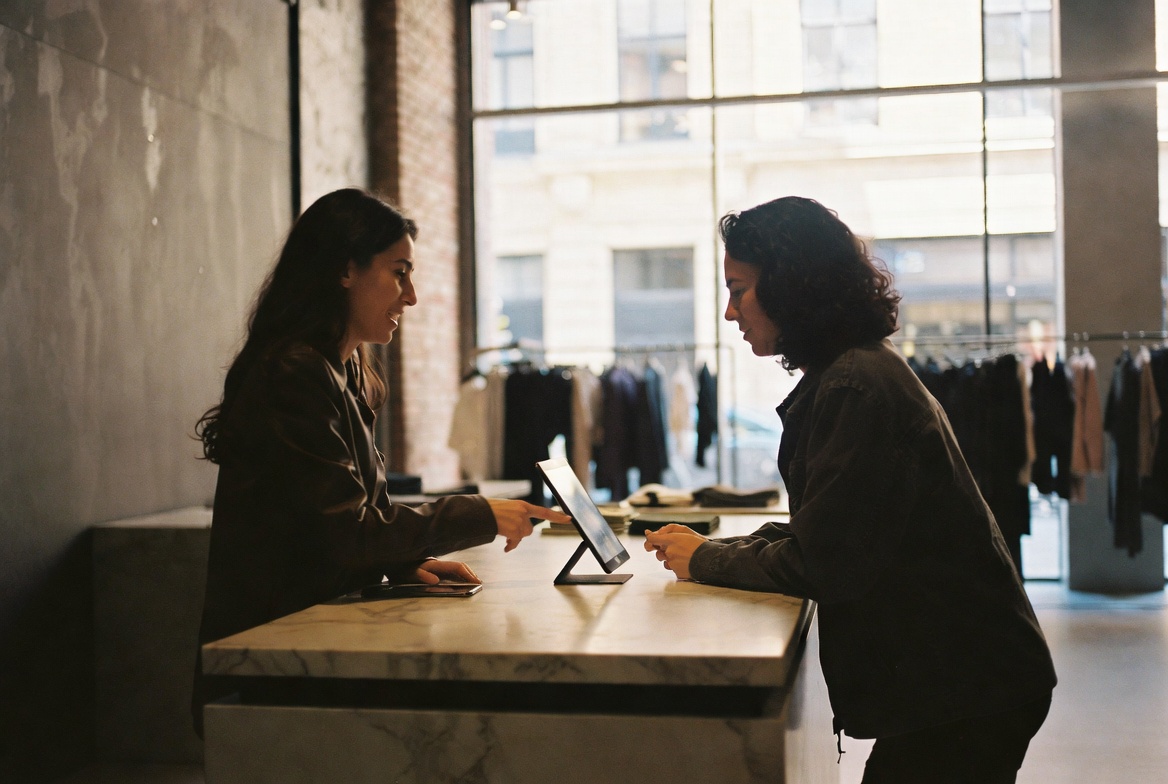 A store associate and customer reviewing a product visualization on a tablet at the counter of a premium retail flagship in Mitte, Berlin.